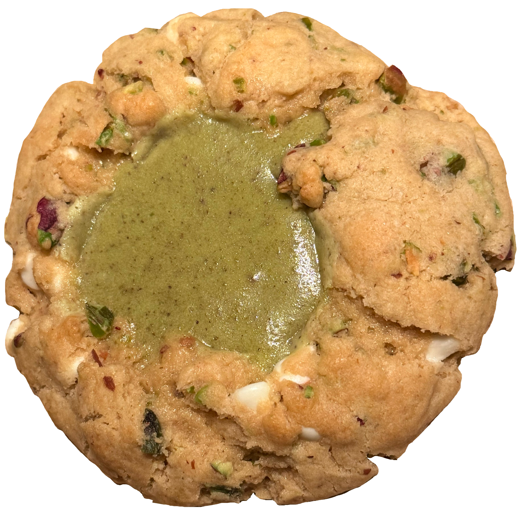 Vanilla cookie dough filled with crunchy pistachios, creamy white chocolate chips, and a sweet pistachio cream filling.